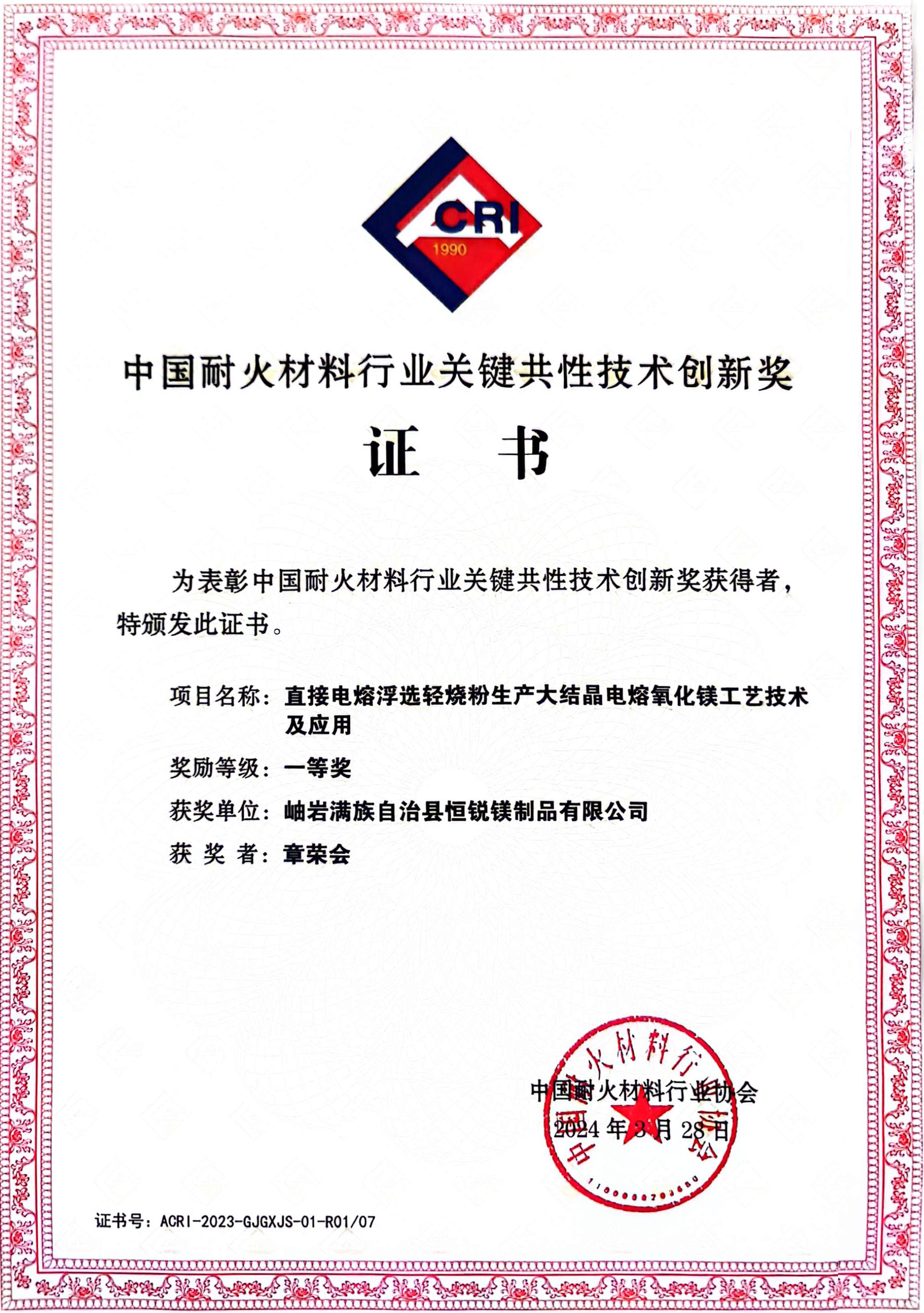 中國(guó)耐火材料行業(yè)關(guān)鍵共性技術(shù)創(chuàng)新獎(jiǎng)(一等獎(jiǎng))
